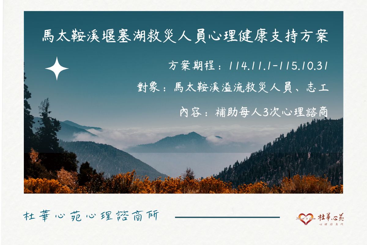 提醒您:請事先進行預約,並請主動表示使用「馬太鞍溪堰塞湖救災人員心理健康支持方案」,會依照順序為您安排專屬於您的晤談空間及諮商師。