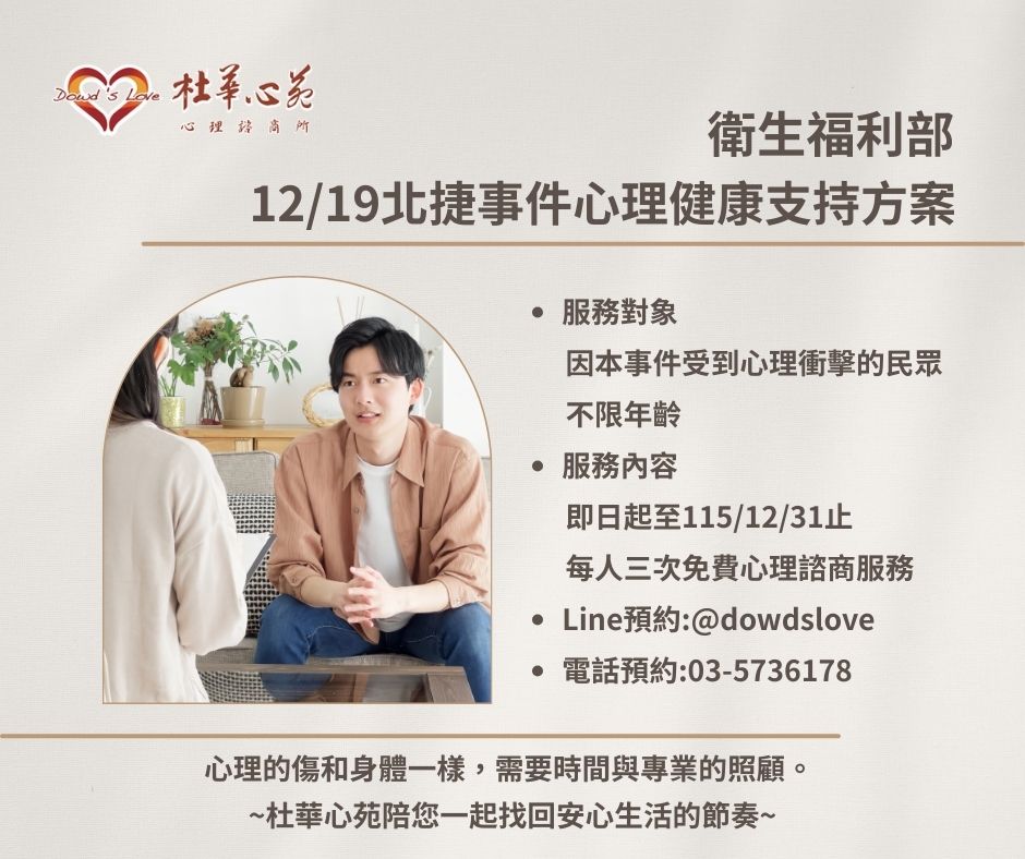 特別提醒: 預約時請主動表示使用**「12/19北捷事件心理健康支持方案」**(或註明「本案目睹或相關情況」),我們將依序為您安排專屬於您的晤談空間及諮商師。